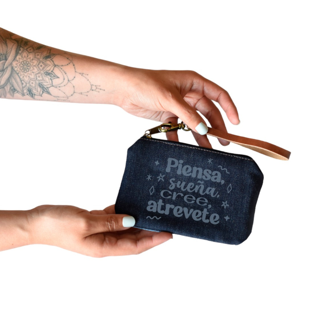 Nuestros estuches son creados con residuos textiles de jeans. Con forro y aplicaciones en cuero, este producto tiene excelente manufactura y calidad.